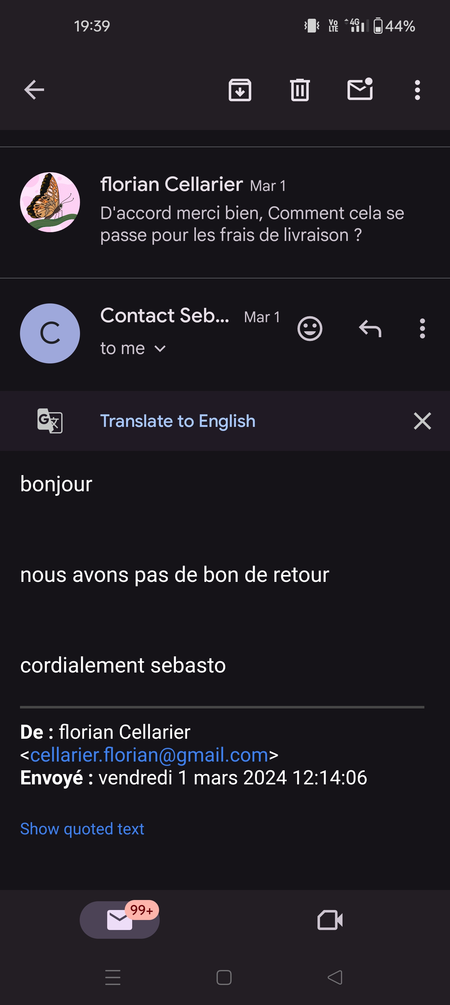Je ne jugerais pas de la qualité de leur envoie ou de leur produits, je n'avais pas encore commander chez eux. Pas contre il ont un numéro de téléphone sur le site qui ne sert a rien. Comme dit dans d'autre commentaires ils sont injoignable. Le téléphone sonne jusqu'au répondeur (plein) puis si on appel plusieurs fois de suite au bout de 3 ou 4 fois une personne vous dit très vitre veuillez patienter svp et la vous pouvez patienter 1h en main libre facilement. Donc que vous soyer déborder c'est une chose, mais répondre du premier coup et dire un instant je termine avec le client et je vous reprend après ca c'est clair et la on peut patienter (même longtemps) sereinement. Jai une boutique et je met un point d'honneur a gérer et les clients comptoir et le téléphone du mieux que je peux. Je pense que vous devriez ou enlever le téléphone ou embaucher quelqu'un pour gérer ca ... Réponse: personne n'a dit que vous ne deviez pas prendre de vacance, et je juge de votre capacité a accueillir, ca fait parti de la société au global. Je vois que vous avez le temps très rapidement de répondre a une remarque, qui est vraie, et il n'y a rien d'autre a ajouter la dessus. Mais ce que je vois c'est que pour répondre a un coup de fil c'est dur mais pour écrire sur internet la c'est rapide et on trouve le temps, pendant ce temps la probablement que quelqu'un n'aura pas la réponse a une question qu'il souhaite vous poser, encore ....